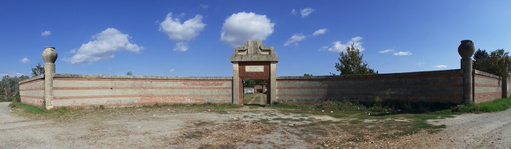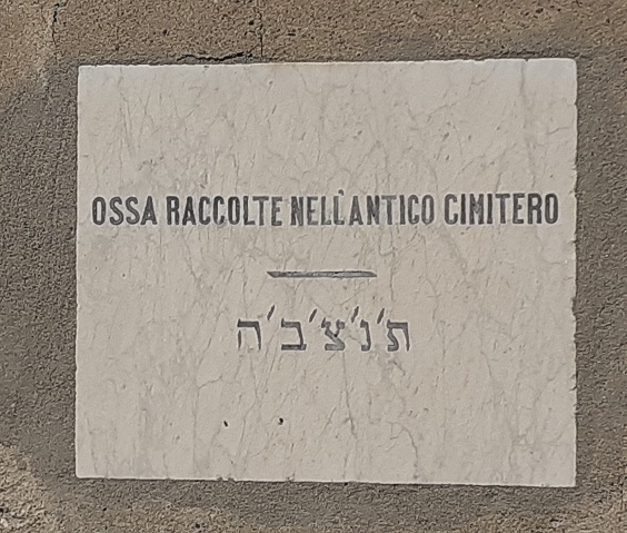 The Jewish cemetery develops for 200 meters in lenght and 50 in width; it present a rectangular plan and a sequence of three fields, respectively called “Ancient department”, “Old departement”, “New departement”. The entrance used regularly is located in the Cimitero Urbano. There is a mail entrance too: a gate opening in the middle of a large curvilinear wall, just in front of the countryside. It’s surmonted by a majestic portal decorated with the Tables of the Law but it’s used during the burial cerimonies only. There are tombstone and stones on the ground or walled up along the perimeter walls,