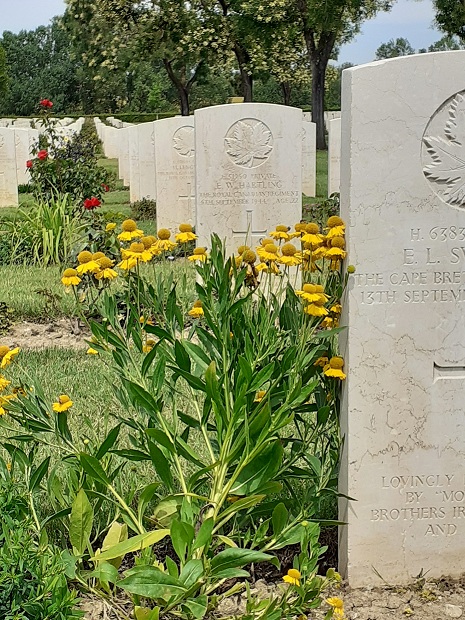 La lancia affiancata da due fulmini rappresenta i RECCE corps – Reconnaissance Corps – i corpi di ricognizione, formati nell’aprile 1941 e sciolti nell’agosto 1946, fondamentali nel raccogliere le informazioni tattiche vitali prima di un’azione. Il loro motto recita: “Only The Enemy In Front” (Di fronte solo il nemico). E troviamo le tante, troppe, foglie d’acero che ricordano i soldati canadesi…