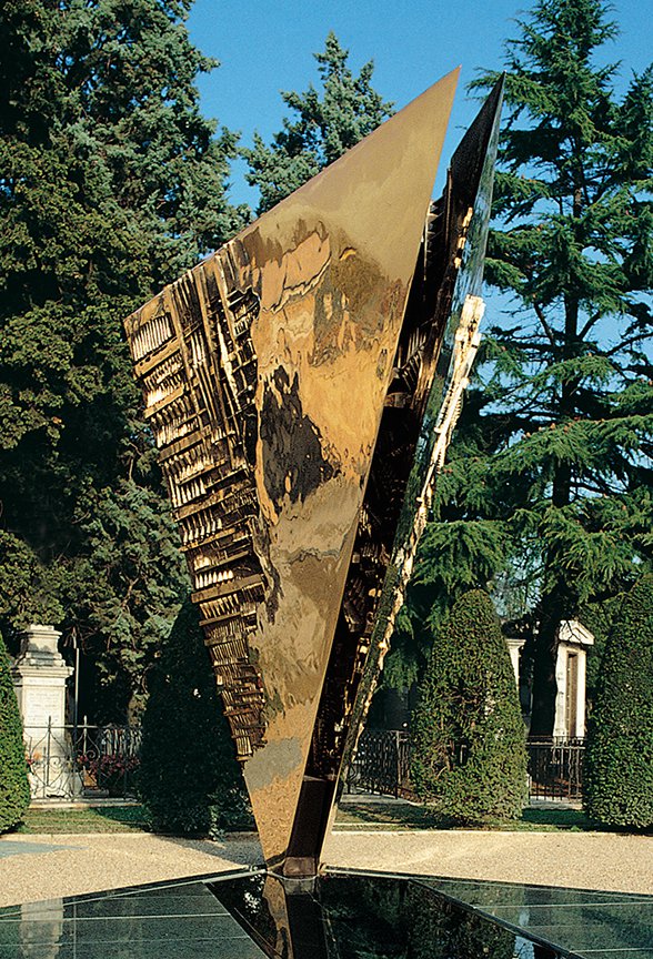 Its changing, mysterious and elusive nature had made water the privileged place of the “passage”: almost all the descents to the pagan or Christian Underworld involve crossing a river, lake or swamp. In all the cultures – in ancient Greece as in Rome, in China as in Brittany – there is the disquieting figure of the ferryman and of his boat, carrying souls crowd during the last voyage. Arnaldo Pomodoro creates a large bow, a four-meter high two-sided triangle melt in polished bronze and carved by the sculptor’s typical marks. Fellini didn’t wish to be buried in the family tomb and the sculptor placed the monument at the Rimini cemetery entrance, so it is visible even when the gate is closed. Here the director lies side by side with Giulietta Masina his wife and with Pier Federico, their son.