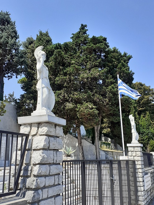 Sui pilastri d’ingresso montano la guardia due sculture di Atena armata: appoggiata da un lato alla lancia e dall’altro allo scudo rotondo in dotazione agli antichi soldati opliti, indossa il cimiero di guerra. Sopra il cimitero sventola la bandiera greca.
