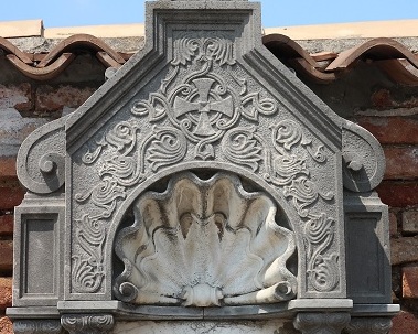 Hence its use in the funerary field. The shell is often carved on Roman sarcophagi, where it frames the image of the married couple as symbol of conjugal love.