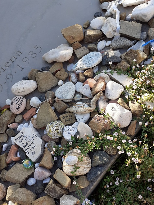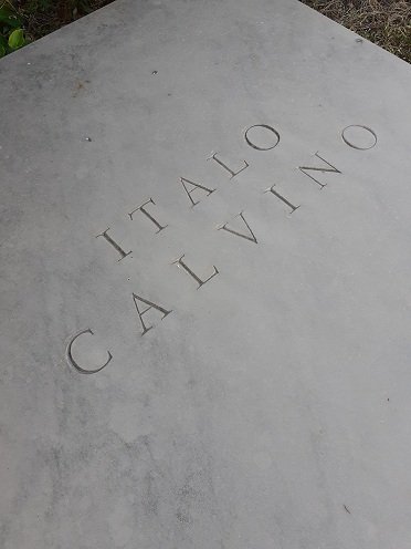 Italo Calvino (15/10/1923 Santiago de las Vegas, Cuba – 19/09/1985 Siena) guarda il mare da un angolo riparato del cimitero di Castiglione della Pescaia, accanto alla moglie Esther Judith Singer, e i suoi ammiratori lasciano sulla tomba pietre e pensieri tratti dai suoi libri.