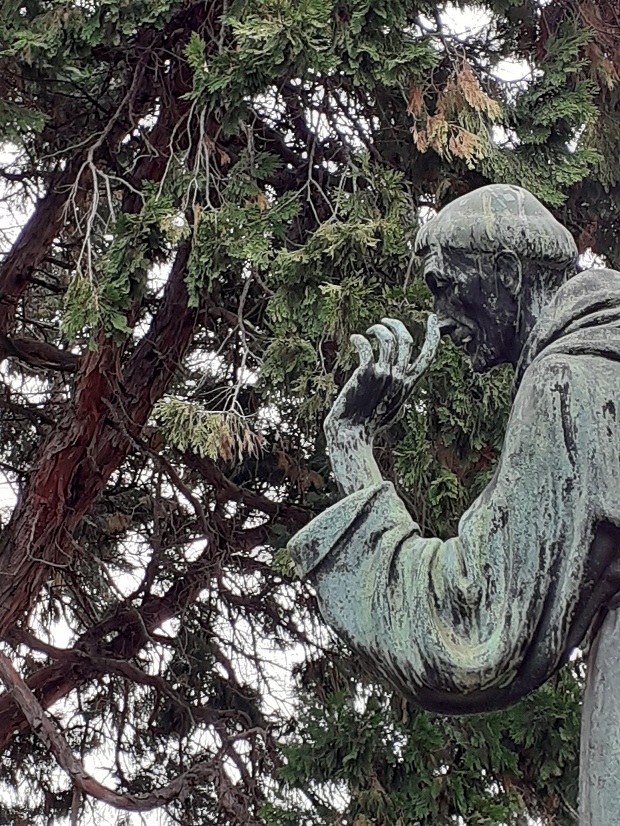 È un gruppo attento quello che ascolta S.Francesco, ogni singolo uccello modellato con maestrìa e fuso nel bronzo, i becchi rivolti al Santo che si apre in un sorriso che cela appena la sofferenza fisica.
