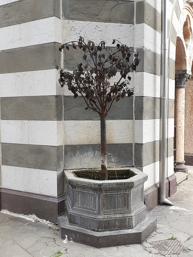 Il 16 dicembre 1930 cripta e monumento scultoreo risultano compiuti e si cominciano a realizzare le due fontanelle richieste dalla Commissione Artistica, costruite sempre su disegno dell’architetto Zacchi; due esili betulle che spuntano dalle vasche addossate alla retrostante Galleria di Levante. La scelta della betulla risponde a una precisa volontà del senatore Cusini che vuole così ricordare gli alberi presenti all’epoca nel piccolo giardino pensile del Santo, ad Assisi.