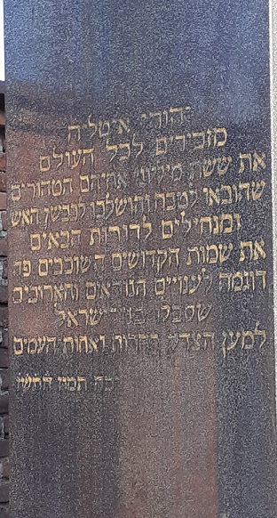 “Gli Ebrei d’Italia ricordano al mondo i sei milioni di fratelli innocenti ferocemente soppressi e tramandano ai posteri nelle vittime qui sepolte un esempio del secolare martirio sofferto dal popolo d’Israele per la giustizia la libertà e la fratellanza umana. 13 luglio 1947.”