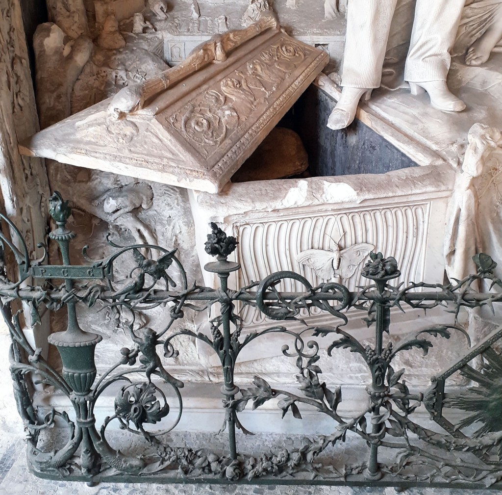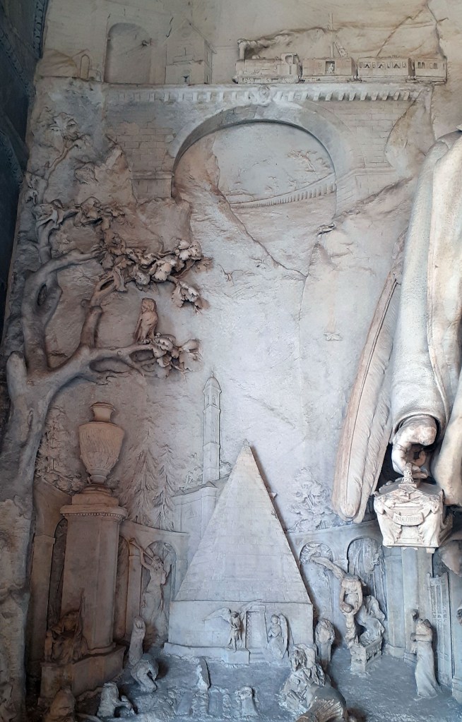 Il complesso programma iconografico ideato dall’ingegnere Giuseppe Pongiglione per la sua tomba e realizzato dallo scultore Lorenzo Vergnano, dopo i due episodi dedicati alla Vita Temporale e alla Vita Spirituale (La Tomba d’j rat dell’ingegner Pongiglione – 1), si concentra sul tema della Morte, che occupa la parte sinistra del monumento.