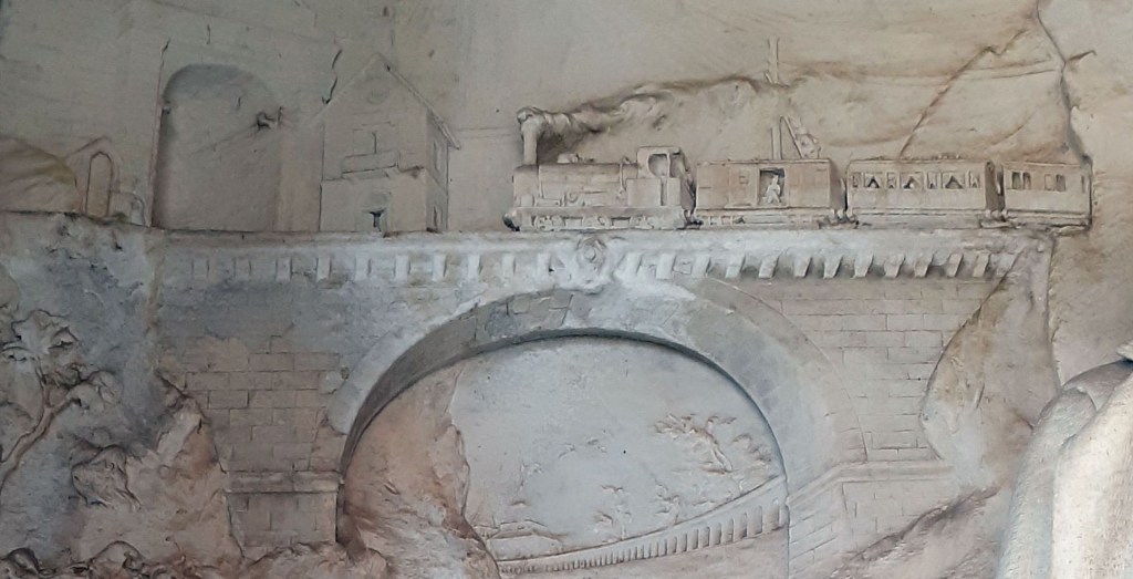 Le montagne coperte da neve perenne – covo di lupi – su cui la vegetazione avvizzisce sono attraversate da una galleria ferroviaria in cui transita un convoglio fornito di locomotiva e vagoni, fuochista, macchinista, passeggeri e bagagli. Se si può andare al cimitero in tram (In Paradiso in tram) o con un’elegante auto funebre elettrica (Auto funebre elettrica Rognini e Balbo, 1927), nulla vieta di fare in treno il viaggio per l’aldilà.