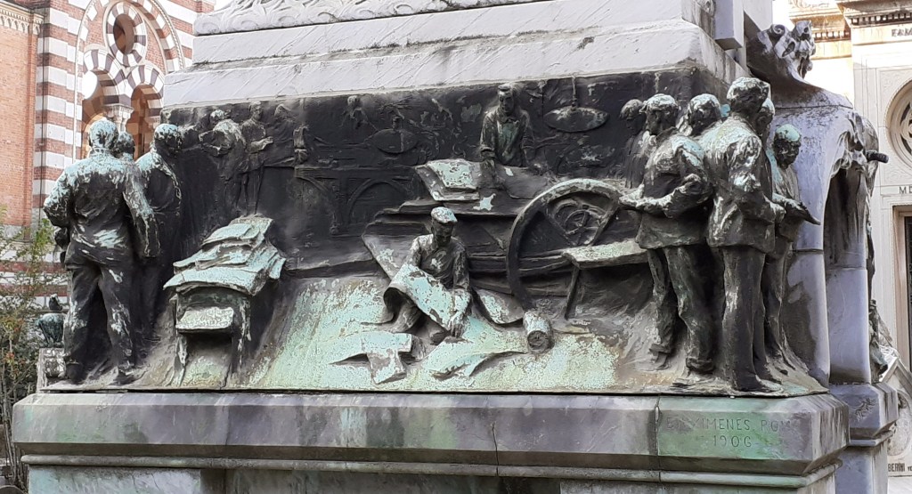 Sui restanti tre lati lo scultore ci trasporta all’interno del reparto di riproduzione fotomeccanica delle immagini che costituiva uno dei fiori all’occhiello della casa editrice Fratelli Treves.