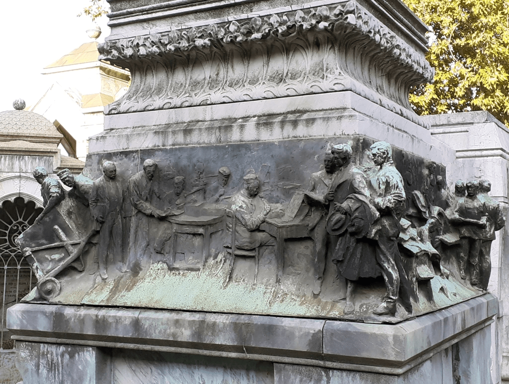 Sul fronte d’ingresso due gruppi ad altorilievo ritraggono rispettivamente Giuseppe Treves e sua moglie, attorniati da amici, intellettuali e scrittori di punta della casa editrice. Fra questi si riconoscono Gabriele D’Annunzio, Edmondo De Amicis e Giovanni Verga.