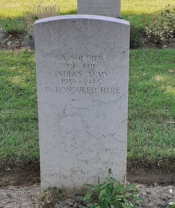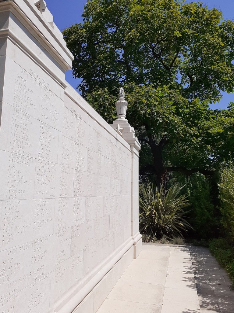 There is no Cross of Sacrifice, instead there is the Cremation Memorial, which holds the ashes of 768 Hindu and Sikh soldiers, cremated after their death, whose names are inscribed on the walls of the monument.