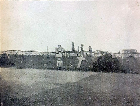 All’inizio il cimitero si presenta privo di qualunque organizzazione: nell’unico campo le inumazioni avvengono senza un ordine preciso e solo in un secondo tempo due viali ortogonali introducono un minimo di regolarità. Al loro incrocio viene posta una colonna votiva mentre sul muro di cinta si affollano – come d’abitudine – lapidi grandi e piccole.