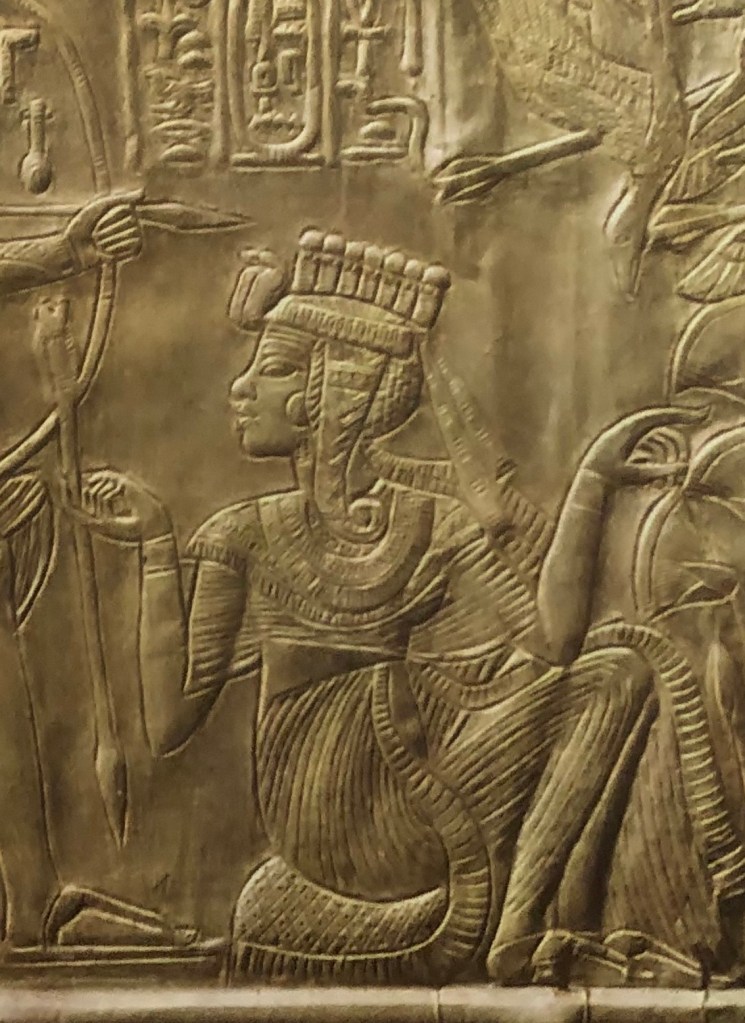 Lei che lo accompagnava nella caccia e gli porgeva la freccia indicando uno stormo di oche selvatiche; lei che gli allacciava il pettorale al collo; lei, elegantissima seduta ai piedi del compagno, mentre il faraone le versa un unguento profumato in mano…