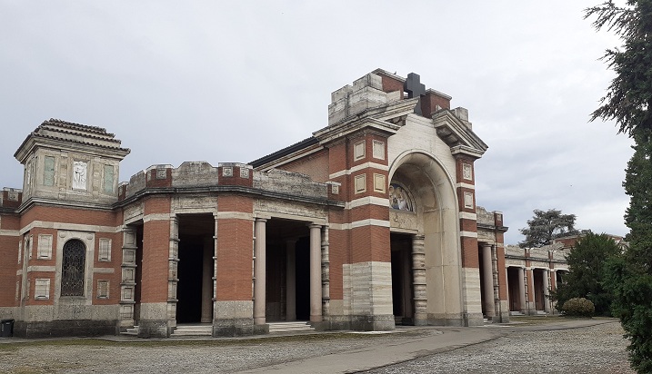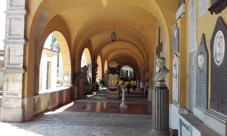Il cimitero si conclude a levante con il lungo e scenografico edificio a colombari, costruito a partire dal 1902 e ampliato successivamente fino al secondo dopoguerra: oggi misura 173 metri e presenta una marcata monumentalità e un’incredibile prospettiva, accentuate dalla volta a botte lavorata a lacunari, di forte impatto grafico, e dalle tre cupole decorate.