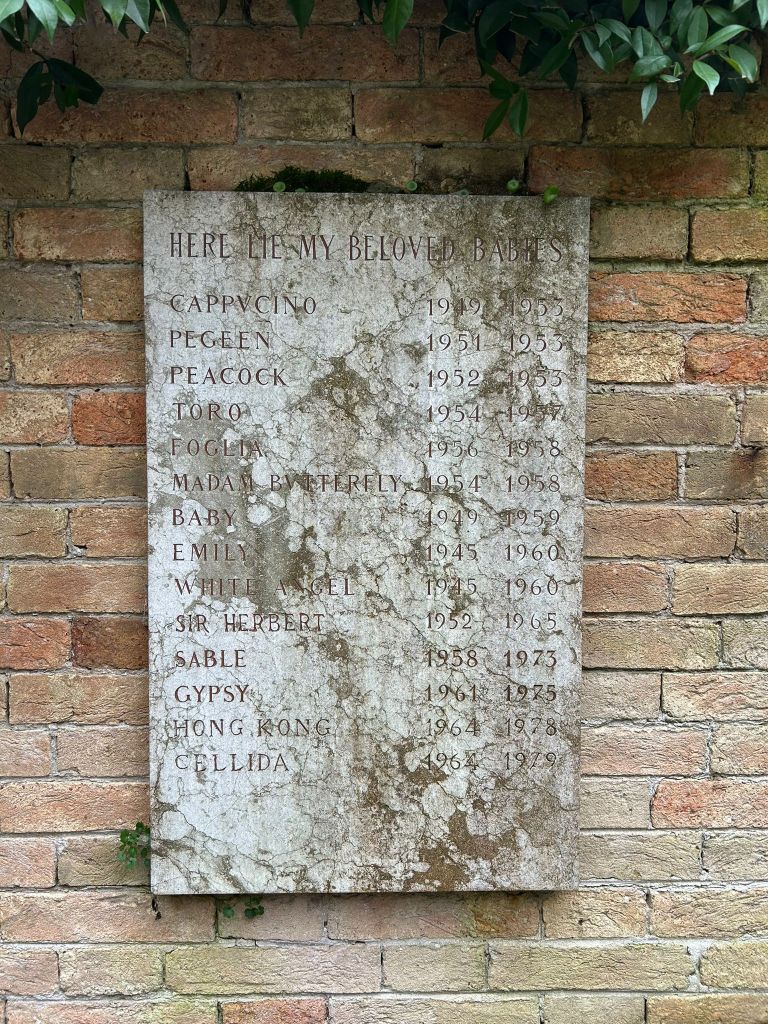 Ma quando sono morta non ho portato nulla con me: solo i miei cani, che ho amato e che mi hanno resa felice. Cappuccino, Pegeen, Peacock, Toro, Foglia, Madame Butterfly, Baby, Emily, White angel, Sir Herbert, Sable, Gypsy, Hong Kong, Cellida.
