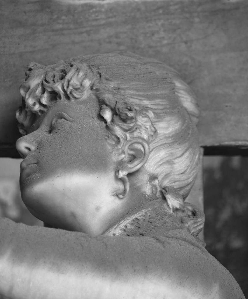 The Amina’s monument representing a sleeping angel at the foot of the cross. The monument dedicated to Jenny depicts her life-size, dressed in an elegant dress, hands folded, leaning on the cross and with the violin she loved and sheet music at her feet.