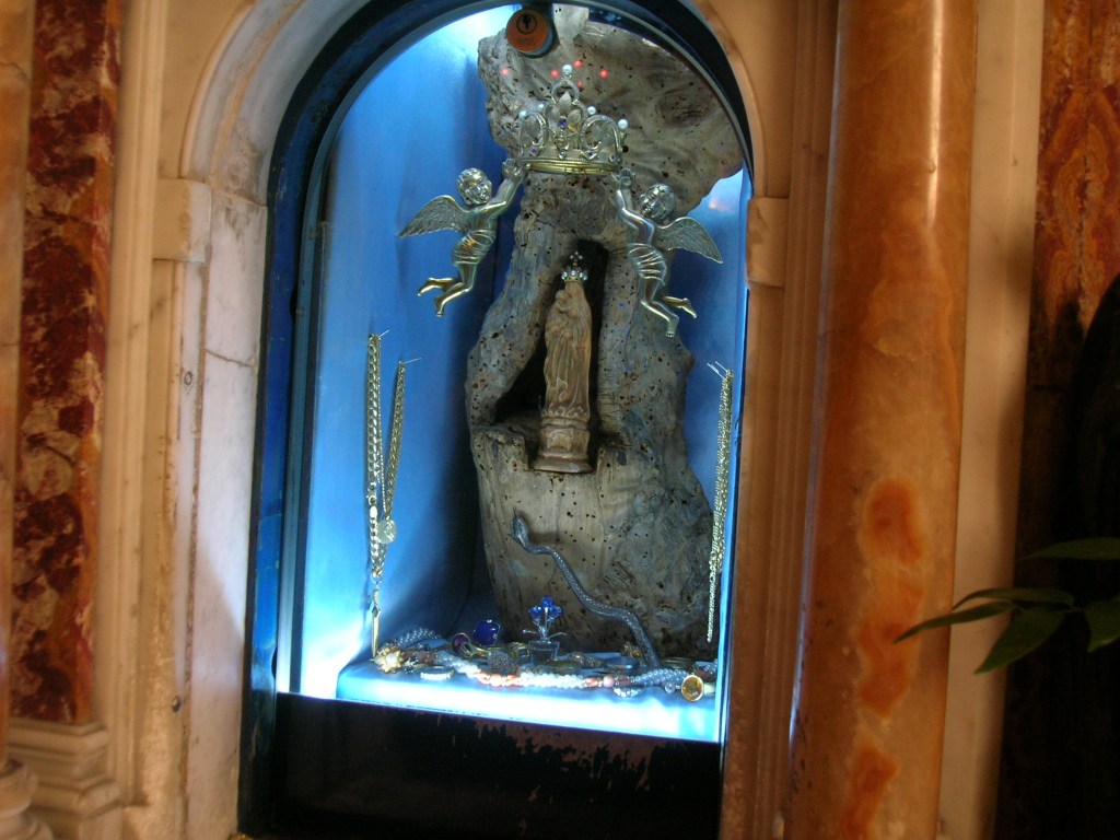 Felicissimo per l’intervento celeste, si era portato a casa la statuina miracolosa, che però aveva dimostrato una spiccata idiosincrasia a qualunque costrizione, rifiutandosi sia di farsi rinchiudere in un forziere dal Broglia, sia di farsi confinare all’interno della Chiesa della Disciplina, come avrebbe voluto il clero locale. Entrambe le volte, infatti, era fuggita, facendo misteriosamente ritorno al suo amato albero. Era stato quindi giocoforza costruire il santuario intorno alla pianta. Qui accoglie i fedeli, nella cappella dell’Apparizione.