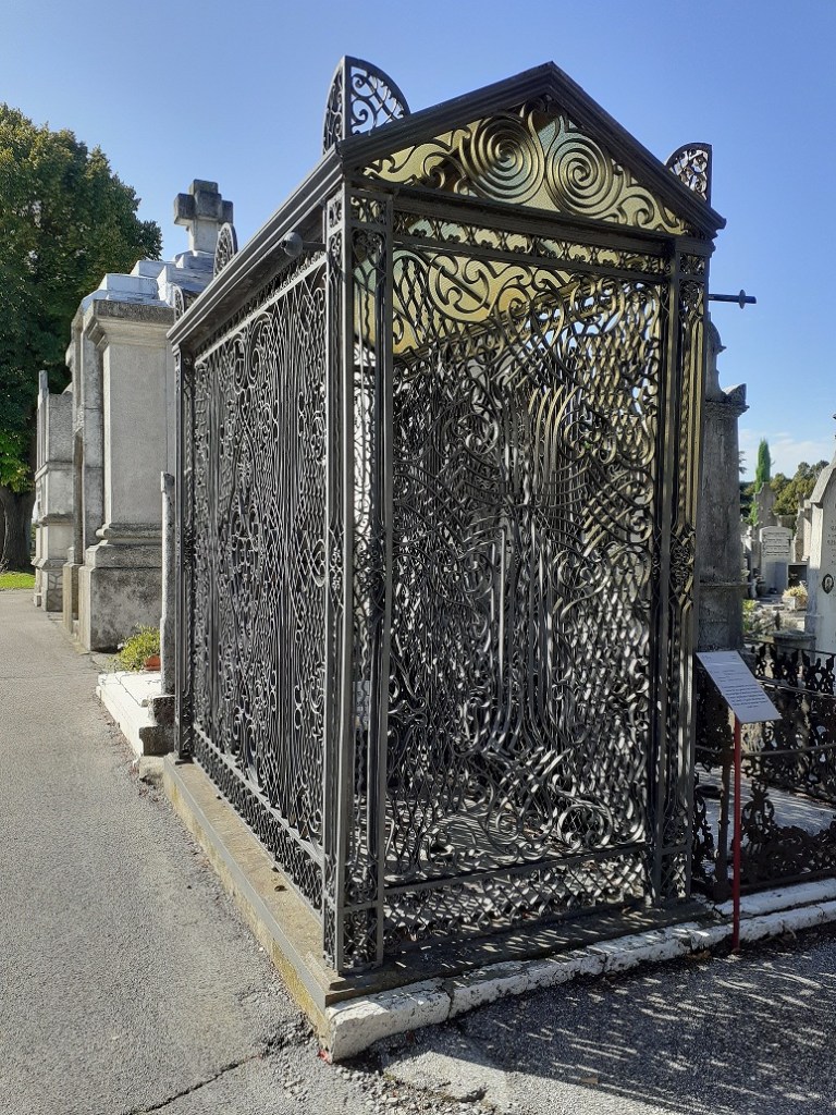 Fra le tombe più originali troviamo l’edicola della famiglia Luppi-Ferrari, costituita da una stupefacente struttura in ferro battuto, in origine intarsiata con vetri policromi: il ferro disegna una fitta trama di arabeschi e volute e si innalza fino a ricostruire la sagoma di una casa, con le pareti e il tetto a due falde, anche se la presenza di piccoli acroteri suggeriscono altre suggestioni: dai templi antichi ai sepolcri etruschi.