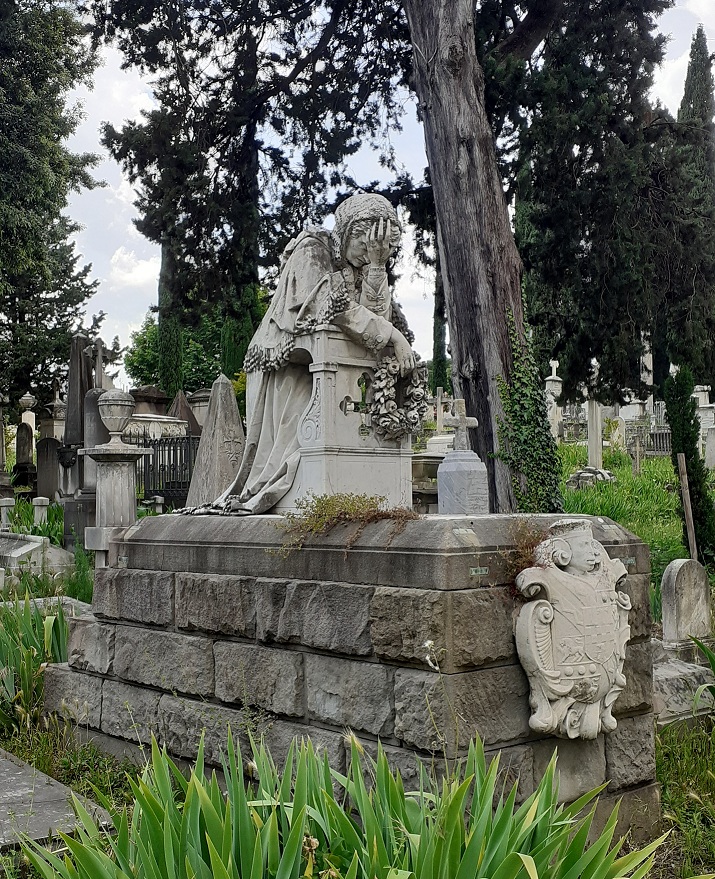 Her husband Walter is also buried in the English Cemetery, under a simple tombstone on the ground, but Julia chooses not to be represented on his tomb: on the contrary, her sculpture turns its back on her husband’s grave, perpetuating for eternity the rift that had already separated them in life and undermining the iconographic and social model of the widow devoted to her spouse, committed to mourning him incessantly for the rest of her existence.