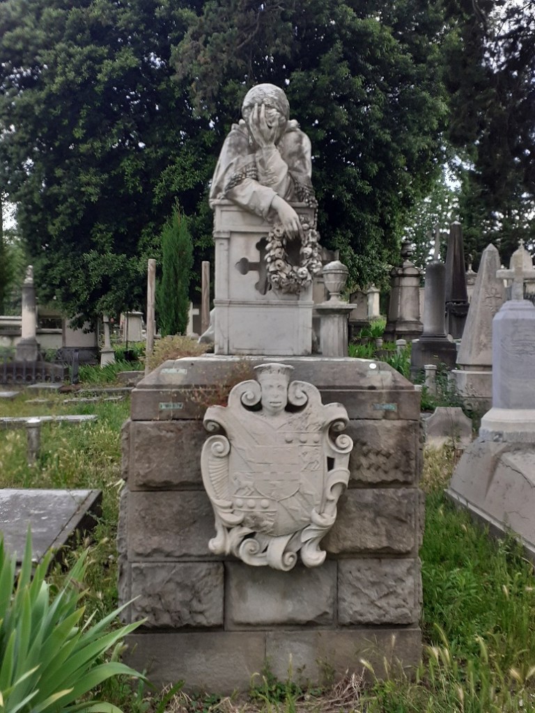 One of the most admired tombs at the English Cemetery in Florence is Arnold Savage Landor’s one, son of the English poet Walter Savage Landor and his wife Julia Thuillier, by sculptor Michele Auteri Pomàr. The life-size sculpture depicts a woman prostrate on a church kneeler: it is a masterpiece of 19th-century realistic portraiture and represents Julia Savage Landor, mother of the deceased, with incredible realism. The sculpture stands on a high plinth embellished with the family crest with the ‘Savage’s head’, reminiscent of the family surname.