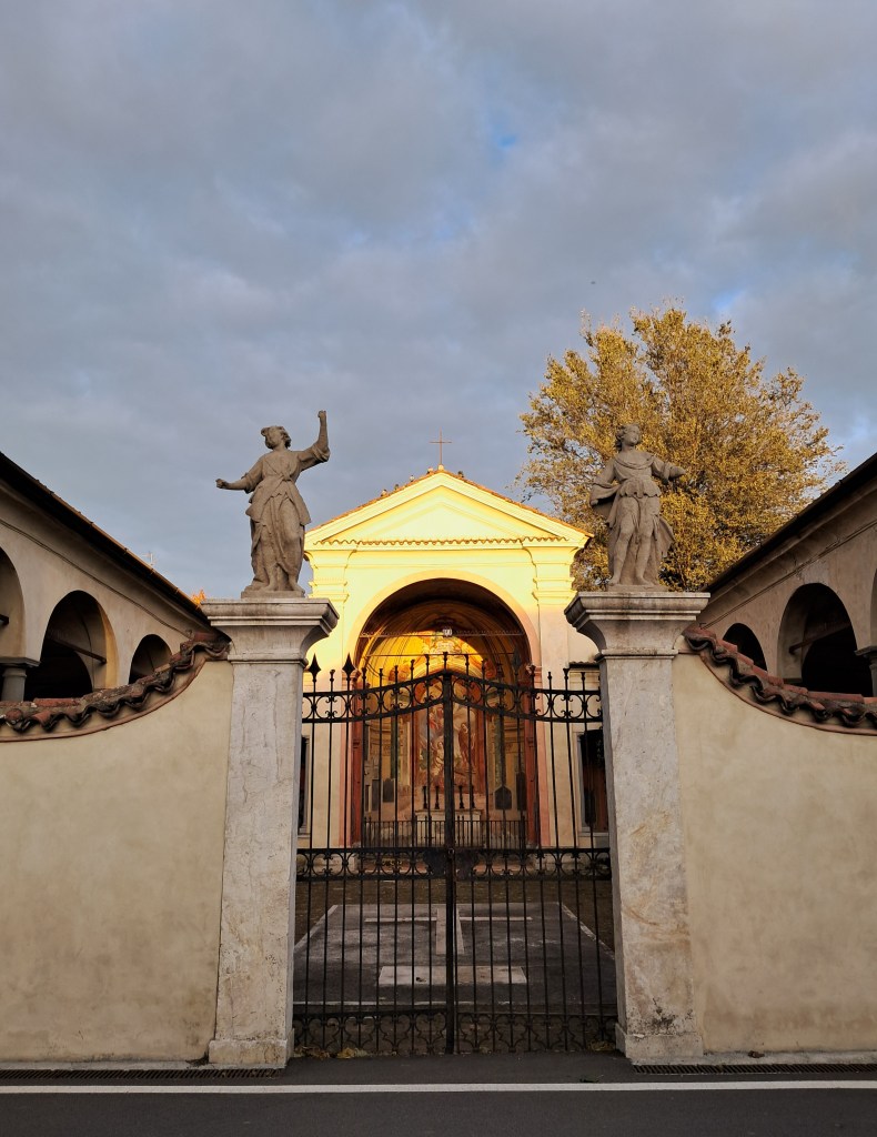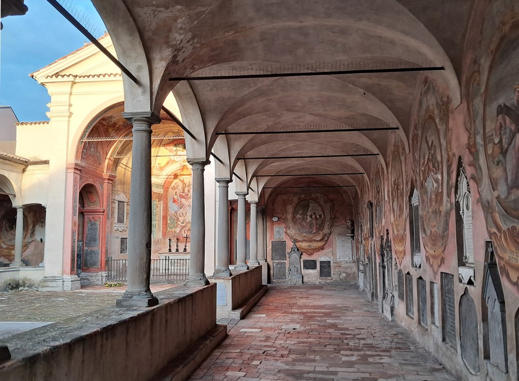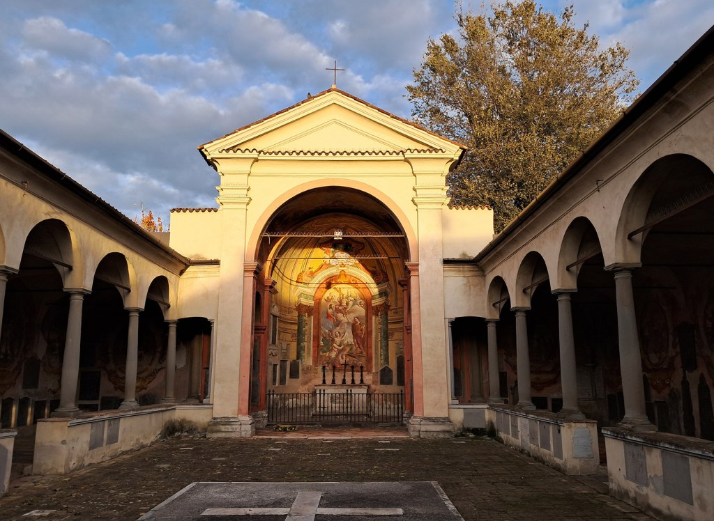 Varcato il cancello sovrastato da due angeli che col tempo hanno perso le ali, si entra in un cortile che conserva ancora il pavimento in cotto originale, al centro del quale una lastra in pietra chiara decorata con una grande croce chiude la fossa comune che ospita gli antichi defunti.