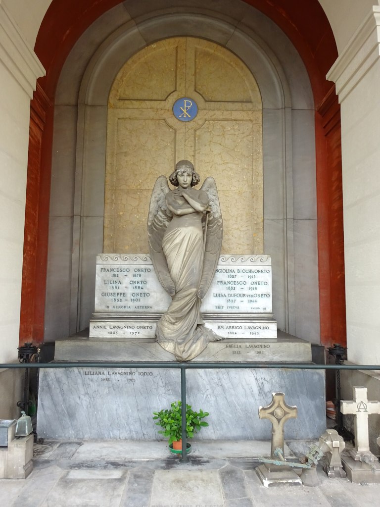La scultura replica l’Angelo della Resurrezione che lo stesso Monteverde ha scolpito nel 1882 su commissione di Teresa Oneto: la bella figlia di un facoltoso genovese che da commerciante in beni coloniali aveva fatto un’enorme fortuna.