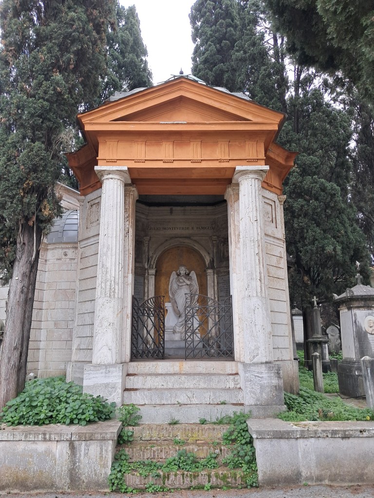 This is the most famous Angel in funeral sculptur in the 19° Century: a global icon with hundreds of copies all around the word. But it isn’t the original statue: it’s a reply carved in 1891 by Giulio Monteverde the sculptor, standing in his own family sepulcher, in Verano cemetery in Rome.