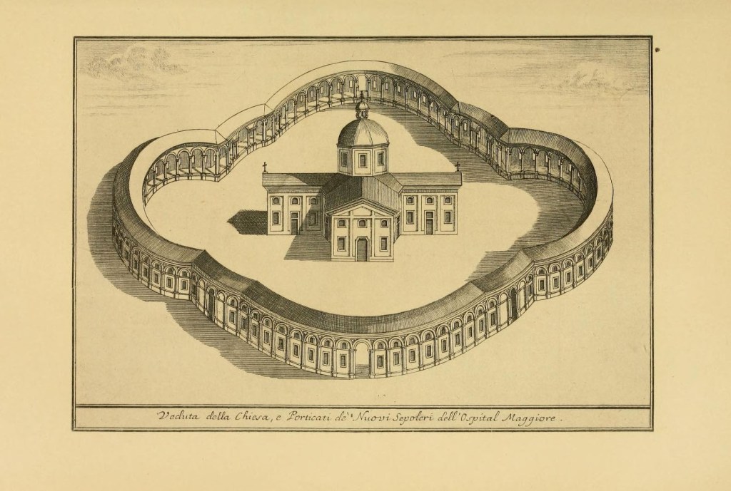 Nel tempo la situazione peggiorava a causa delle continue esumazioni e delle infiltrazioni d’acqua dal naviglio. I miasmi divennero insopportabili e la presenza del cimitero intollerabile. Fu così che i consiglieri dell’Ospedale nel maggio 1694 acquistarono dalla famiglia Stella alcuni terreni posti tra la chiesa di Santa Maria della Pace e le mura della città, per costruire un nuovo sepolcro coperto con annesso oratorio.