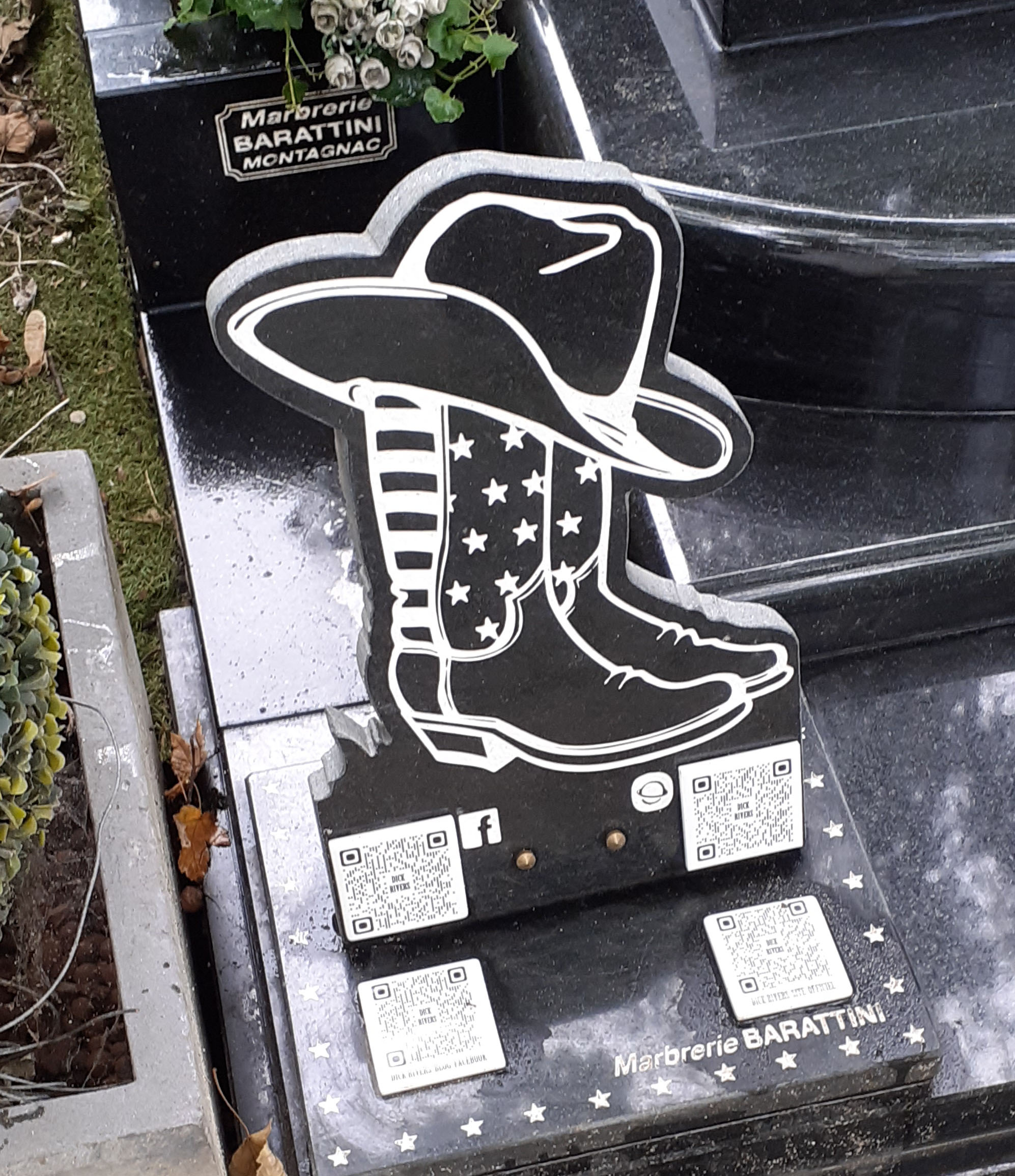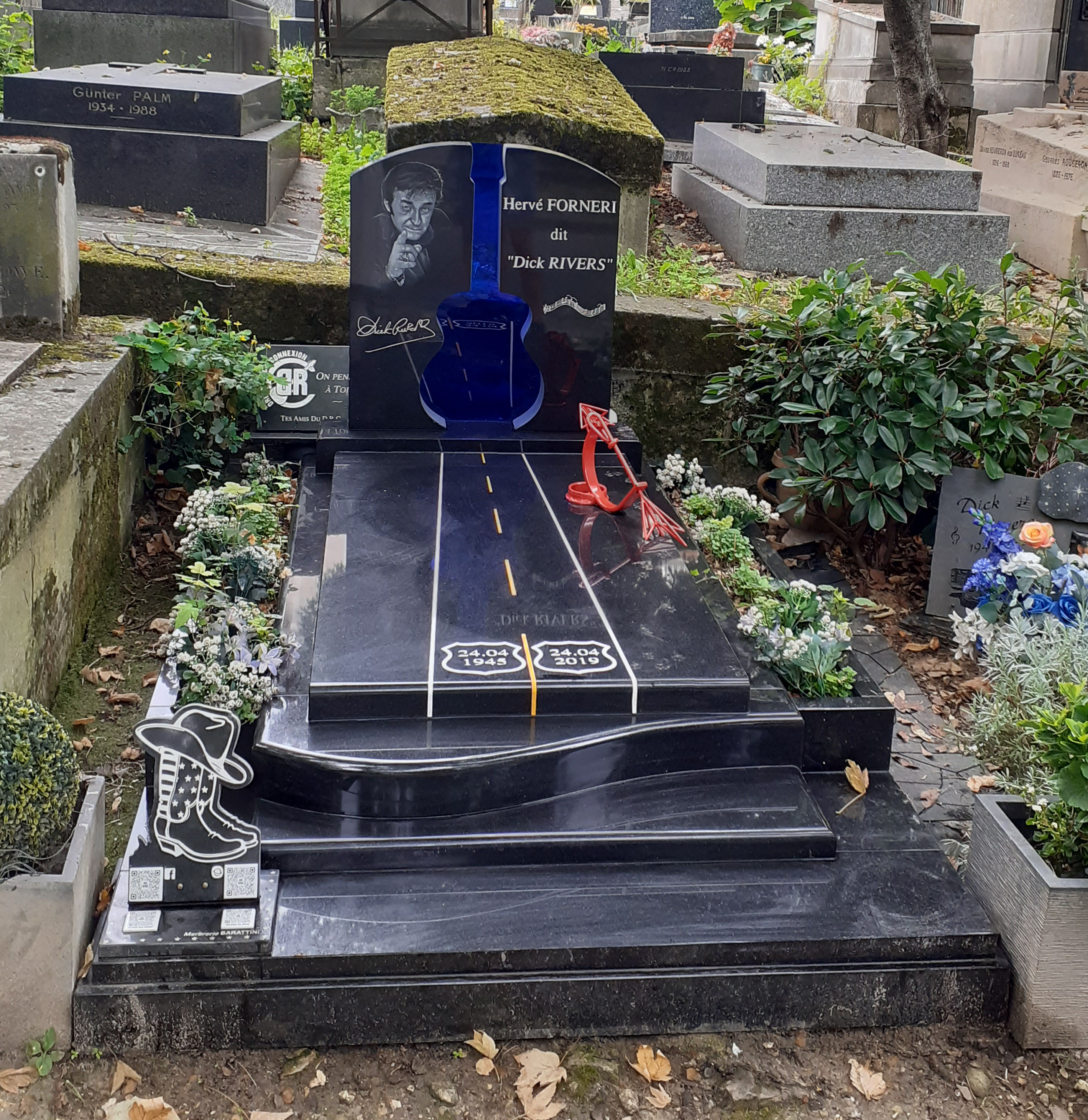 Chitarre elettriche, stivali e cappello da cowboy per il cantante francese Dick Rivers (Parigi, Cimitero di Montmartre). (Electric guitars, boots and a cowboy hat for French singer Dick Rivers (Paris, Montmartre Cemetery).)