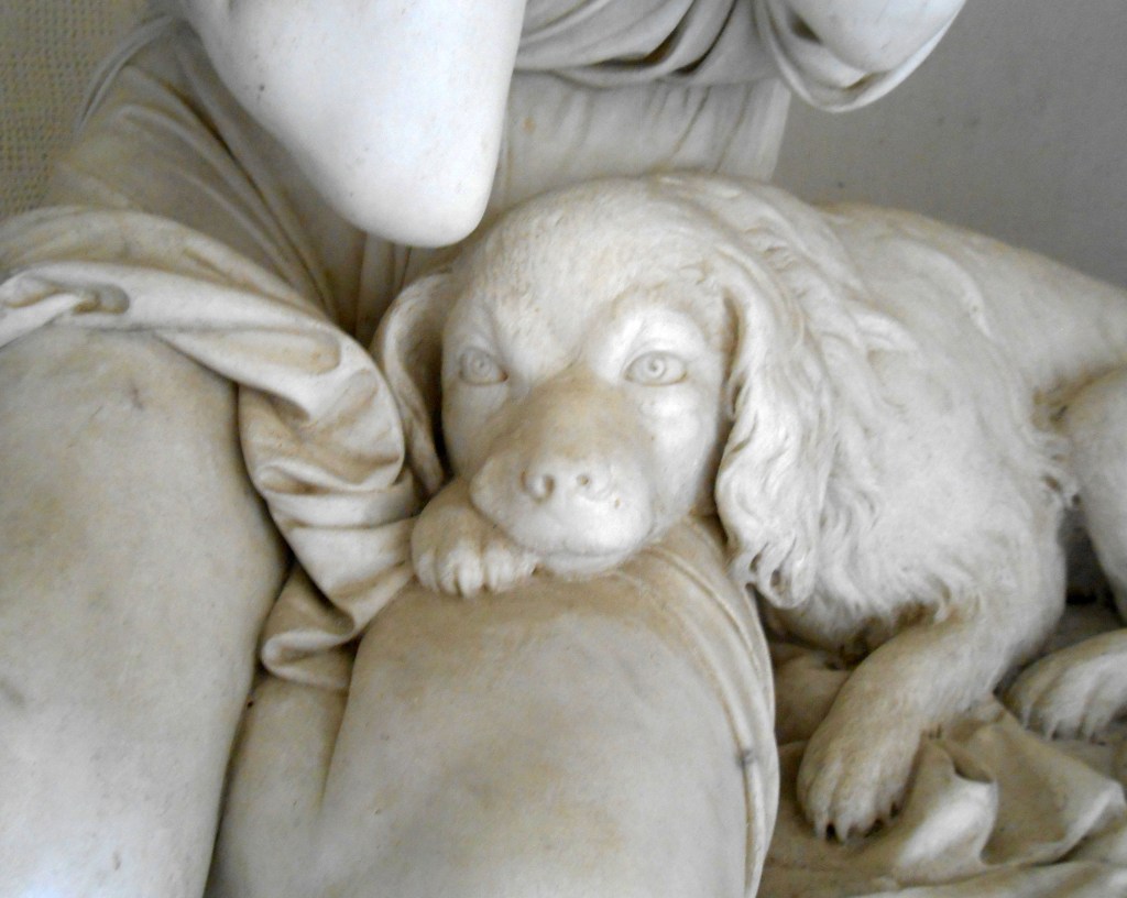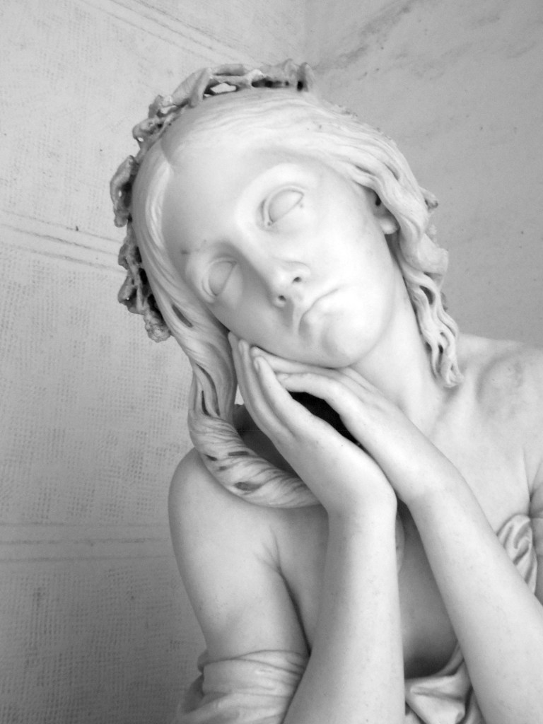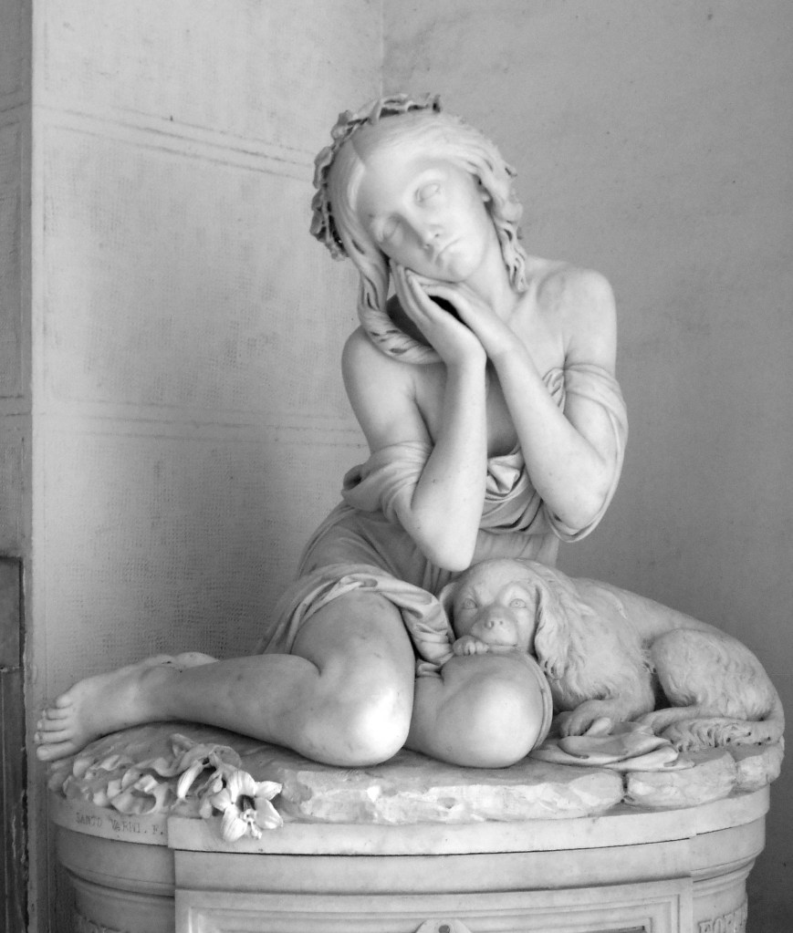 Ti ho ritratta giovane, come sarai per sempre nei miei ricordi, perché il tempo non potrà toccarti. Ti copre una veste umile e leggera, senza ornamenti, per ricordare la tua semplicità. Sensuale quanto basta ma senza malizia, per ricordare a tutti che eri mia moglie e ne ero orgoglioso. Solo i capelli a incorniciare il bel viso e una corona di fiori. Le mani giunte accanto al viso: rassegnazione, preghiera o ultimo addio. Accanto a te ho posto il giglio spezzato della giovinezza pura che il tempo non potrà corrompere e sulle tue ginocchia un cagnolino, simbolo di quella fedeltà che tu hai avuto per me. Un cagnolino per non lasciarti sola, perché il marmo è freddo e la morte oscura. Un cagnolino per ricordare il calore della nostra casa.