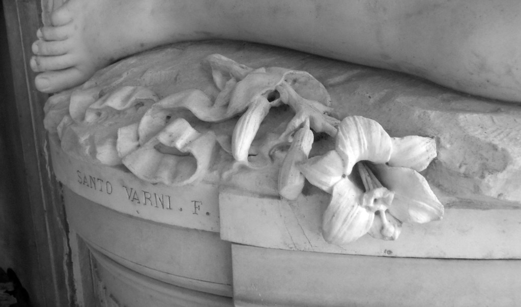 Godi in Dio / pace e premio del lungo e virtuoso patire / o Giuditta / che vivendo di fede di preghiera d’affetto / era all’afflitto consorte Santo Varni / sollievo nelle amarezze ispiratrice amorosa / nel culto dell’arte. / Deh! L’immagine del tuo casto sorriso / la ricordanza delle sante parole / che proferivi morendo / spargano un raggio di luce / nella solitudine in che mi lasciasti. / Mancò nel mattino del XXVII (27) giugno MDCCCLXXIII (1873).