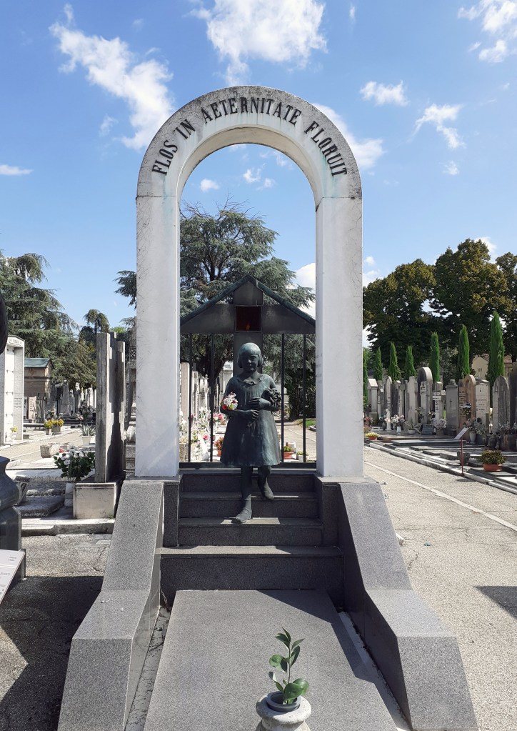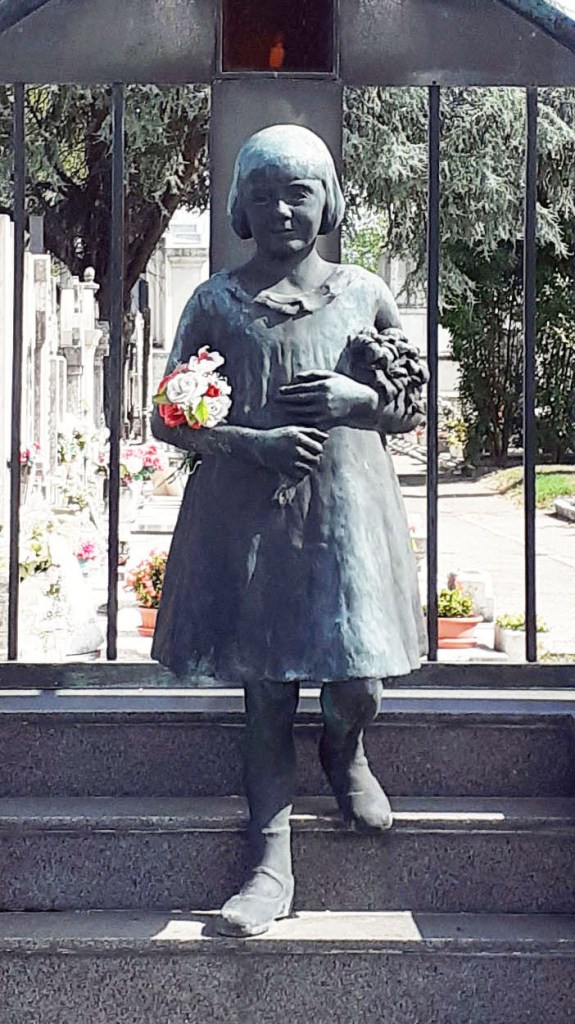 Dal punto di vista iconografico, la statua eredita da un lato il modello ottocentesco della fanciulla che regge un mazzo di fiori – attributo femminile tradizionale a ricordare la grazia e la gentilezza ma anche la vita troncata prematuramente (leggi anche: I Gigli del Cielo. Monumento Elisi) – dall’altro il tema, comune sulle sepolture infantili, del bambino che stringe a sé un gioco; tema inaugurato da Pietro Canonica nel monumento Pratis eretto alla piccola Laura Vigo nel Cimitero Monumentale di Torino, morta a soli 9 anni. (Campo Primitivo. Cimitero Monumentale di Torino 2)